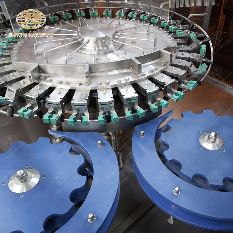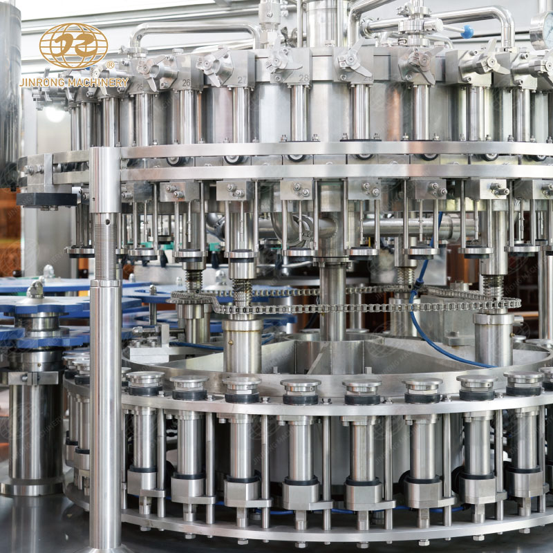 三合一含汽飲料灌裝機集清洗、灌裝、旋蓋于一體的灌裝設備,成套飲料生產線適合汽水、可樂、蘇打水、氣泡水等。玻璃瓶含汽飲料灌裝機組內部一次完成洗瓶、灌裝、封蓋三道工序,瓶子磨損小、傳動準確平穩、瓶型更換便捷。